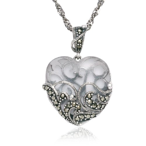 Choose a bold romantic look with this large clear glass heart pendant, cradled in a textured sterling silver filigree setting with glittering dark marcasite stones. The ornate pendant is featured on a substantial 18-inch Singapore twist chain.