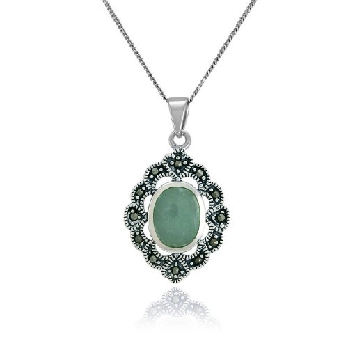 This vintage-inspired pendant highlights a green jade oval, mounted in a bezel setting of polished sterling silver and surrounded by a decorative border. The scalloped-edge border glitters with dark marcasite set in textured and oxidized sterling silver. The pendant is showcased on 18-inch sterling silver curb chain. Beautiful jade is a stone associated with good fortune, health, and prosperity.
