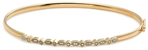 This easy-to-wear flex bangle bracelet is a graceful accent on your wrist. Made from 10 karat yellow gold, it shimmers with a slender line of genuine diamonds in princess and tapered rectangular frames. There are 23 petite round diamonds altogether, for a total diamond weight of .075 carat. The bracelet fastens with a tongue-in-groove clasp and has a safety lock for added security.
