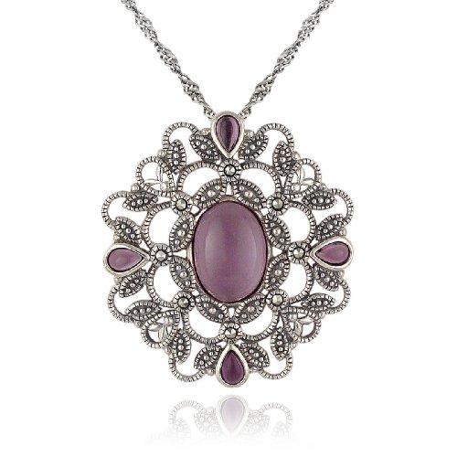 Enjoy vintage elegance with this glittering sterling silver and marcasite openwork pendant, detailed with oval and pear shapes of amethyst-purple glass. The ornate pendant has a feminine floral motif and presents on a substantial 18-inch Singapore twist chain.
