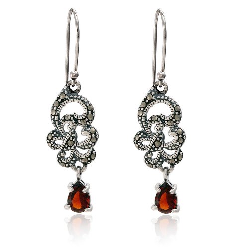Add a little old world elegance to your jewelry rotation with these gorgeous dangle earrings, featuring teardrop shapes of garnet red cubic zirconia suspended beneath elaborate floral swirls of sterling silver. The silver swirls are richly textured and detailed with glittering dark marcasite stones. Sterling silver hooks with beaded tips complete this intriguing pair.