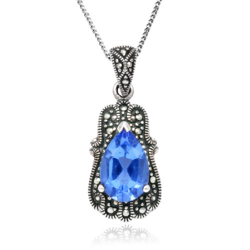 This gorgeous blue crystal pendant looks as though it belongs in an estate collection. The focal point is a single faceted pear of vivid blue glass, mounted atop an ornate frame of textured sterling silver and shimmering dark marcasite. Suspended from a decorative matching bail, this stunning pendant will light up your look, and bring out the blues in your eyes or outfit. It presents on an 18-inch sterling silver curb chain.