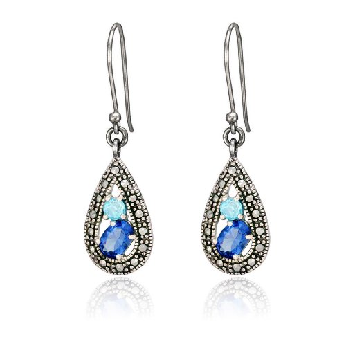 Frame your face in beautiful blues with these ornate sterling silver dangle earrings, featuring sparkling glass stones in two shades of topaz-blue. The round and oval stones are set inside open teardrops detailed with glittering dark marcasite. These eye-catching earrings are crafted in 925 sterling silver and featured on polished silver hooks with beaded tips.