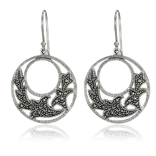 Enjoy the beautiful texture and shimmer of these sterling silver circle drop earrings. Ridged silver circles frame a graceful leaf pattern enhanced with glittering dark marcasite stones. These stylish dangles are finished with bead-tipped sterling silver wires.